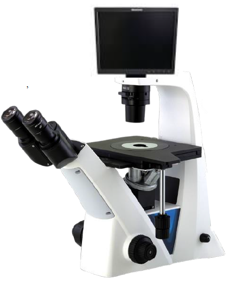 Microscópio biológico invertido trinocular de alta performance, projetado para aplicações avançadas em laboratórios de cultura celular, pesquisa e análise de materiais. Equipamento robusto, com estativa metálica, sistema óptico de alta transmissão e componentes com tratamento anti-fungo.